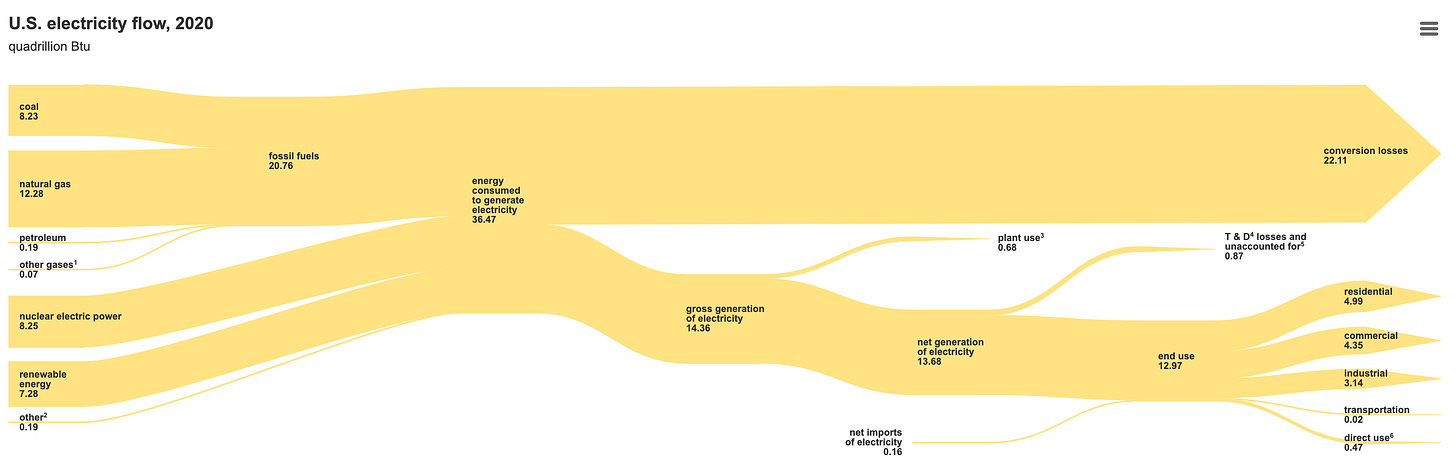 I am a firm believer that the single most important thing we can do for the environment is decarbonize how electricity is supplied to our grid. Thanks in large part to wind and solar becoming the cheapest forms of energy, we’re moving in the right direction. If we are able to achieve 40% wind and solar power by 2030 (which is the current administration's goal), we will still have a majority of the grid that needs sources other than wind and solar. Currently we use a mix of natural gas, coal, and nuclear. This graph below is helpful visualization for where our electricity comes from.